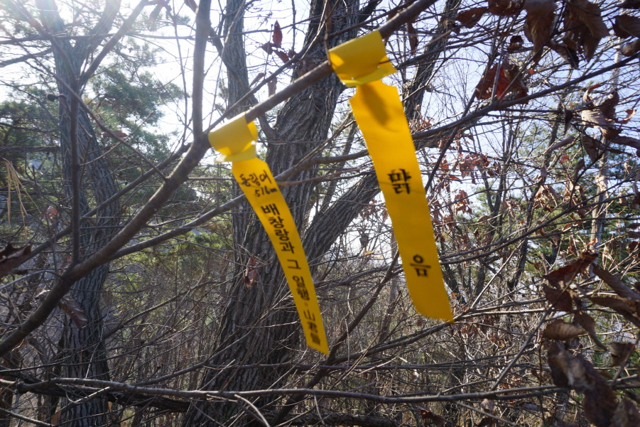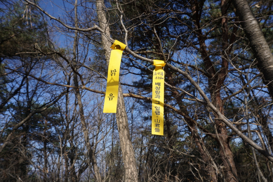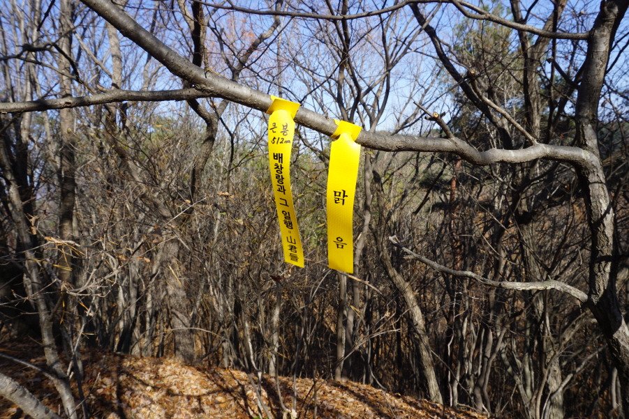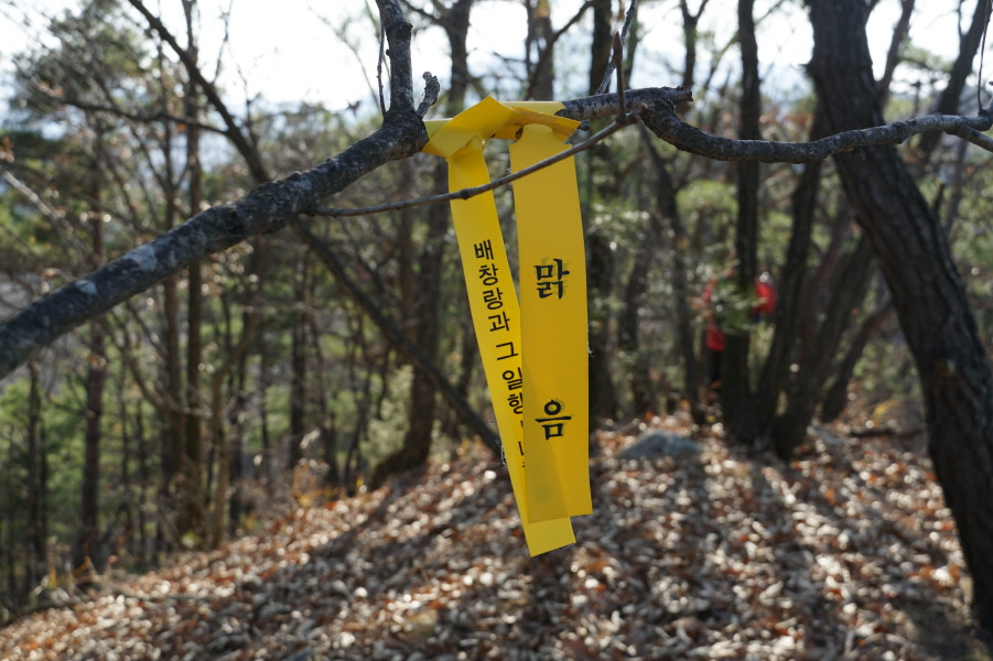 대삼각점 있다. 먼저 가면서 부착한 준족 맑음님 표지기 옆에 "큰 봉 512m 배창랑과 그 일행=山君들"표지기 건다.