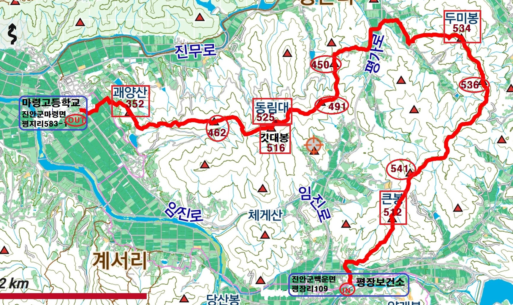 산행코스; 상동경로당( 전북 진안군 백운면 평장리 109) → 마을도로→임도 → 급경사오름길 → 큰 봉(512) → 541 → 능선 오르내림 → 536 → 두미봉(534) → 탄곡길 → 성령골 → 임도 → 주능선안부 → 450 → 491 → 봉림대 (525) → 깃대봉(516) → 462 → 임도 → 잡목구간 → 괘양산 (352) → 마령고등학교( 전북 진안군 마령면 평지리 583-1)