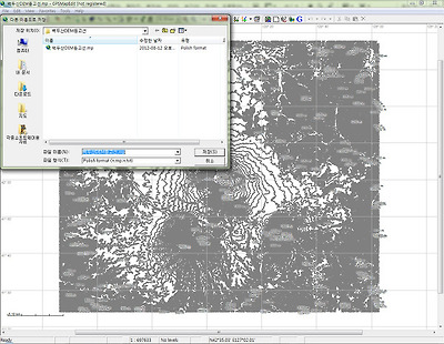 이상태에서 메뉴바 → File → Save As 를 이용하여 파일형식에서 Polish format(*.mp;*.txt)를 선택하여 "백두산DEM등고선.mp" 라는 이름으로 저장한다.