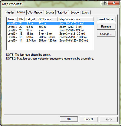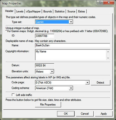 그다음 메뉴바 → File → Map Properties를 선택하여 열리는 Map Properties Dialog 창에서 Hearder 탭을 선택한 후 아래그림을 참조하여 입력하고, Levels, cGpsMapper 탭도 아래그림들을 참조하여 입력한다.