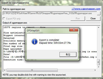 작업이 완료되어 위의 그림과 같은 확인 창이 나타나면 확인 버턴을 클릭하고 Export to cgpsmapper.exe Dialog 창도 Close버턴을 클릭하여 닫는다.