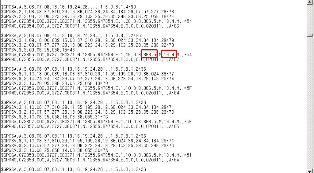 $GPGGA,072648.000,3727.060371,N,12655.647654,E,1,09,0.8,366.5,M,19.4,M,,*5D