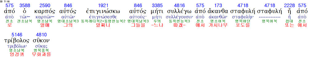 이게 헬라어 원문입니다. 잘 보세요. 그의 열매로 그를 알찌니.. 여기까지는 맞아요. 그런데 그 다음을 보시면 3385메티 가 나옵니다. 이건 ~아니다 라는 뜻의 부정어입니다. 이걸 번역을 안 한 거라구요. 우리 성경은 '~느냐' 이렇게 번역을 했지만 그런 뜻이 아니라