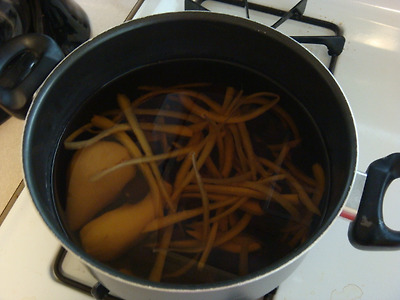 물(2000㏄)에 진피(말린 귤껍질 20g)와생강(2쪽)을 넣고 1시간 정도 끓인 다음
