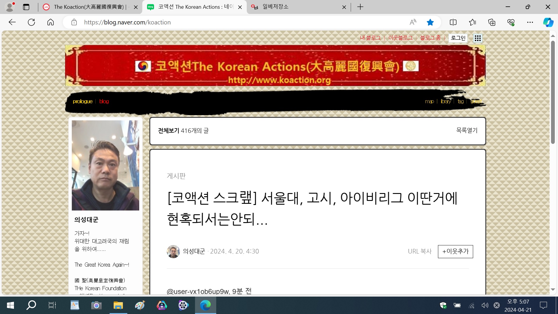 하단에 첨부한 사진과 같이 나는 코액션 블로그를 네이버에서 운영하고 있었는데,