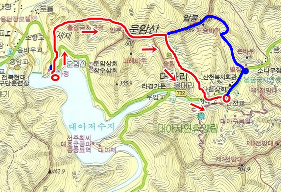 A팀:새재(대아정)~소나무전망봉~운암산~593봉~저승바위~산천마을 갈림길~칠백이고지갈