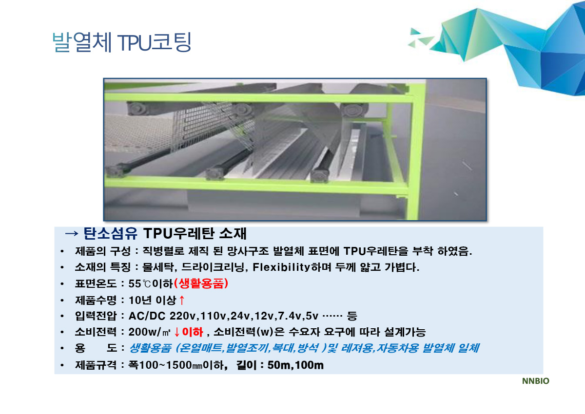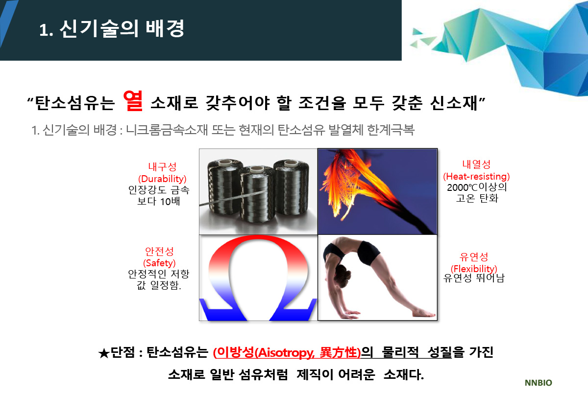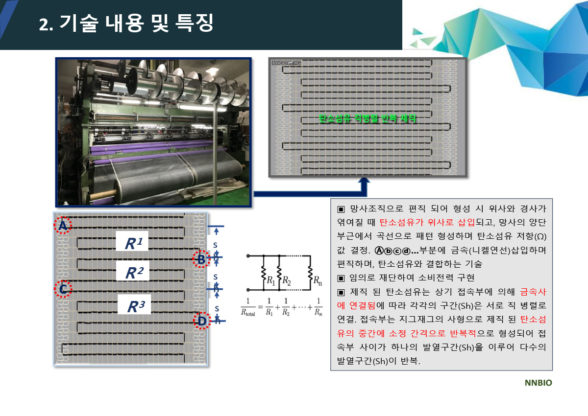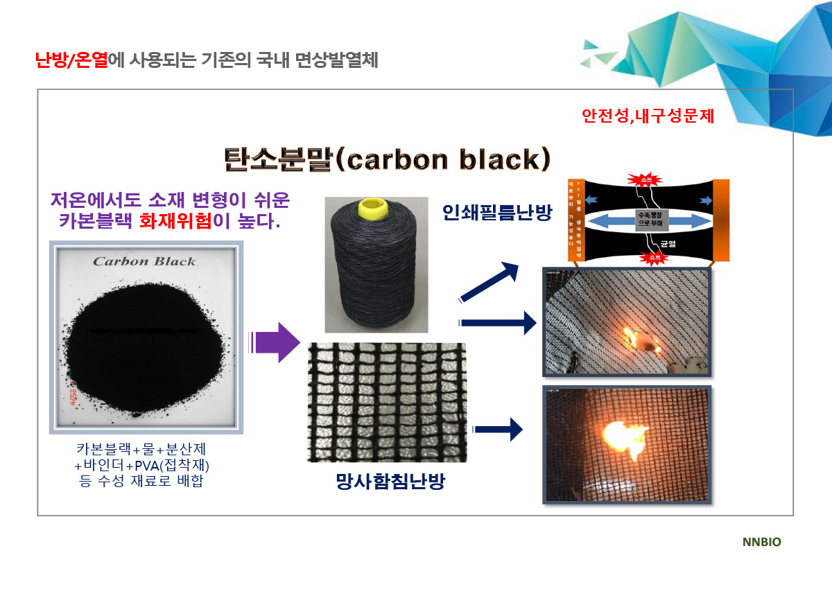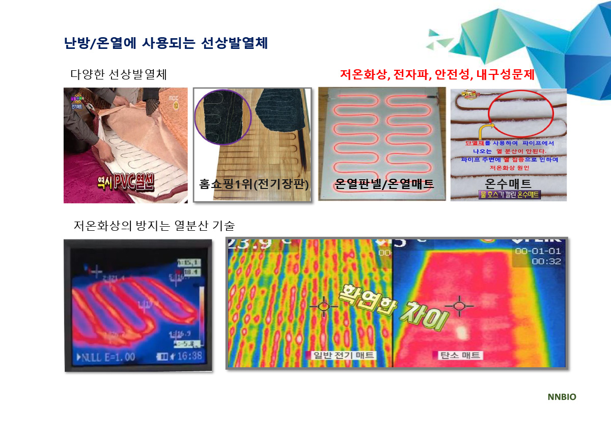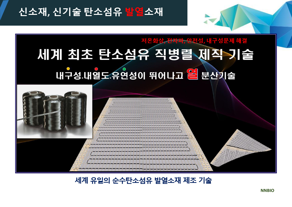 ▣ 세계 최초로 새로이 개발된 특허기술 "순수 탄소섬유 면상발열체 직병열 직조기술"의 DC 면상발열체를 사용하여 열분산으로 저온화상과 스파크로 인한 각종 위험요소를 해결하였습니다. 선상 발열체가 가진 열분산의 어려움을 해결하여 저온화상의 위험을 해결하고, 탄소 화합물을 인쇄한 필름방식, 탄소 파우더를 망사에 함침하는 방식, 탄소 파우더를 코팅한 원사로 직조하여 발열시 스파크에 의한 화재의 위험을 완벽하게 해결하였습니다.