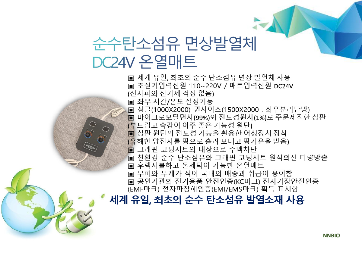 지파이온 블랙다이아몬드 그래핀 온열매트 신제품 '엔엔바이오 지파이온 블랙다이아몬드그래핀 DC24V 온열매트는 세상에 없던 새로운 기술로 만들어진 수맥 차단 및 전자파가 없는 아주 특별한 매트입니다.