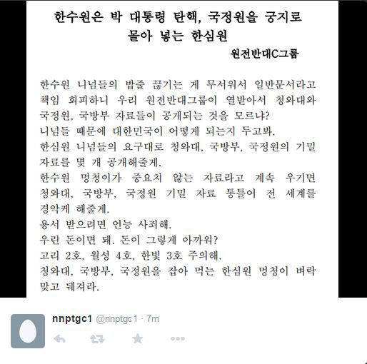 이들은 트위터에 "한수원 니넘들의 밥줄 끊기는 게 무서워서 일반문서라고 책임 회피하니 우리 원전반대그룹이 열받아서 청와대와 국정원, 국방부 자료들이 공개되는 것을 모르냐"며 "한수원 멍청이가 중요치 않는 자료라고 계속 우기면 청와대, 국방부, 국정원 기밀 자료 통틀어 전 세계를 경악케 해줄게"라고 썼다.