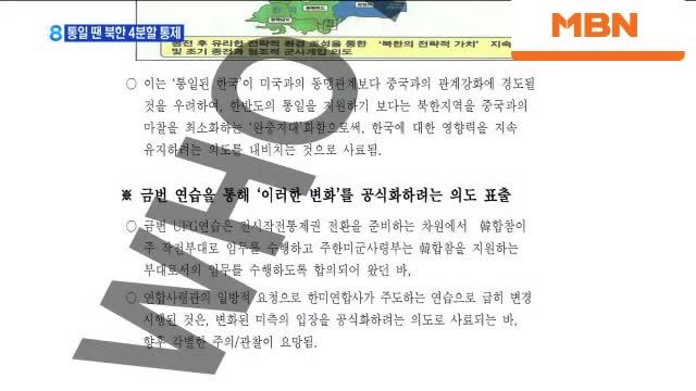 5일 한 방송 보도에 따르면 한미연합훈련과 관련된 사항을 기록한 것으로 보이는 이 자료에는 '북한지역을 4개국이 분할 통제하는 방안에 대한 논의를 합참에 요청함'이라고 적혀 있다.