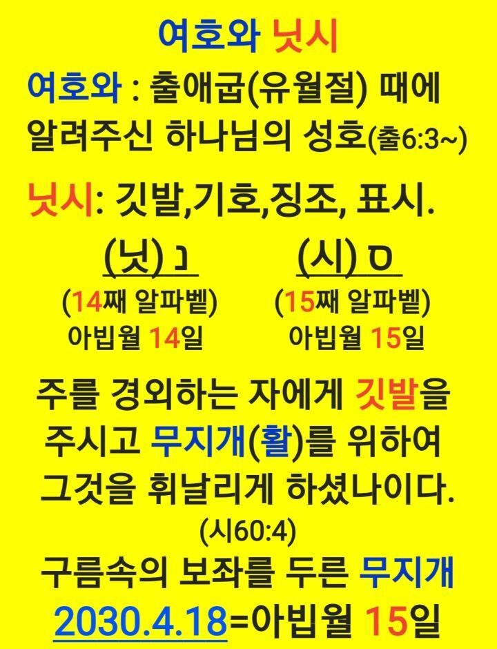 닛시의 경우는 히브리어 단어 두 글자로 되어 있는데 첫글자 "닛"은 14번째 알파벹이고 "시"는 15번째 알파벹이다. 이것은 주님의 십자가의 깃발 즉 아빕월 14일과 15일을 상징적으로 의미하고 있다. 주님은 십자가에서 승리 하셨다. 십자가는 주님의 "영광"이다. 승리의 깃발이다. 여호와 닛시는 예수님을 믿는 모든 자들이 영원히 기념할 아빕월 14일,15일을 의미한다.