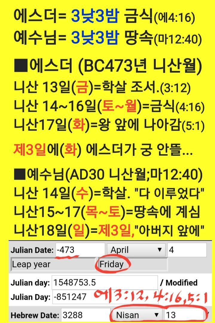 "당신은 가서 수산에 있는 유다인을 다 모으고 나를 위하여 금식하되 밤낮3일동안 먹지도 말고 마시지도 마소서 나도 나의 시녀로 더불어 이렇게 금식한 후에 규례를 어기고 왕에게 나아가리니 죽으면 죽으리이다"(에 4:16) = 토요일,일요일,월요일 만3일동안 금식함.