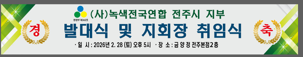 녹색전국연합 전주시지부(2/28/토) 작성자환경인|작성시간25.12.02|조회수137 목록 댓글 0 글자크기 작게가 글자크기 크게가 녹색전국연합 전주시지부(이태규) 발대식 및 지부장취임식(임원단친선모임)*일시:2026년2월28일(토)17시~*장소:전북 전주시 완산구 어은로 30 (금양정 전주본점)*참석:초청임원00명 감사합니다 다음검색 현재 게시글 추가 기능 열기 북마크 공유하기 신고 센터로 신고 댓글 댓글 0 댓글쓰기 답글쓰기 댓글 리스트