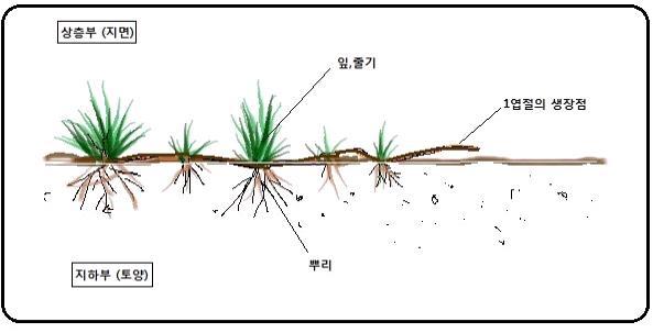 - 주형(Bunch type) 잔디로 포복경이 없어 옆으로 길수는 없고 다만 분얼에 의해서 주수가 늘어나 지면을