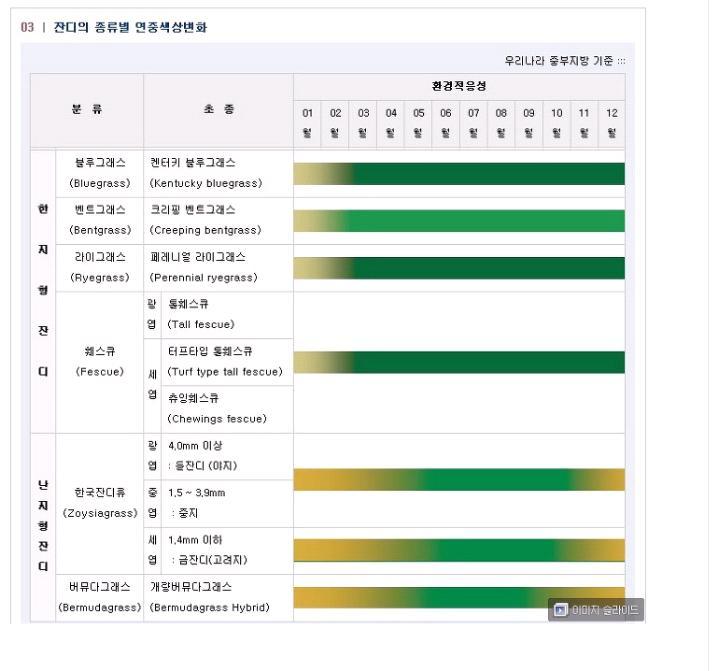 - 난지형잔디 : 5~9푸른색, 나머지는 황색