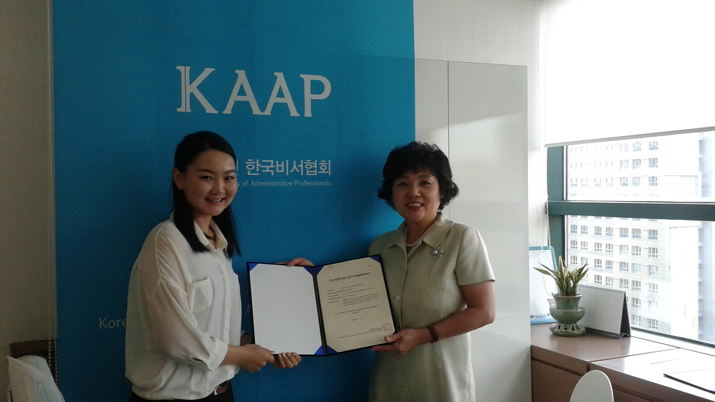 이민경회장이 이화여대 국제사무학과(비서학과)에 유학와 있는 이수진(몽골 이름 바타르, Jessica Jsc )가 한국비서협회에서 인턴쉽을 마치고 수료증을 수여
