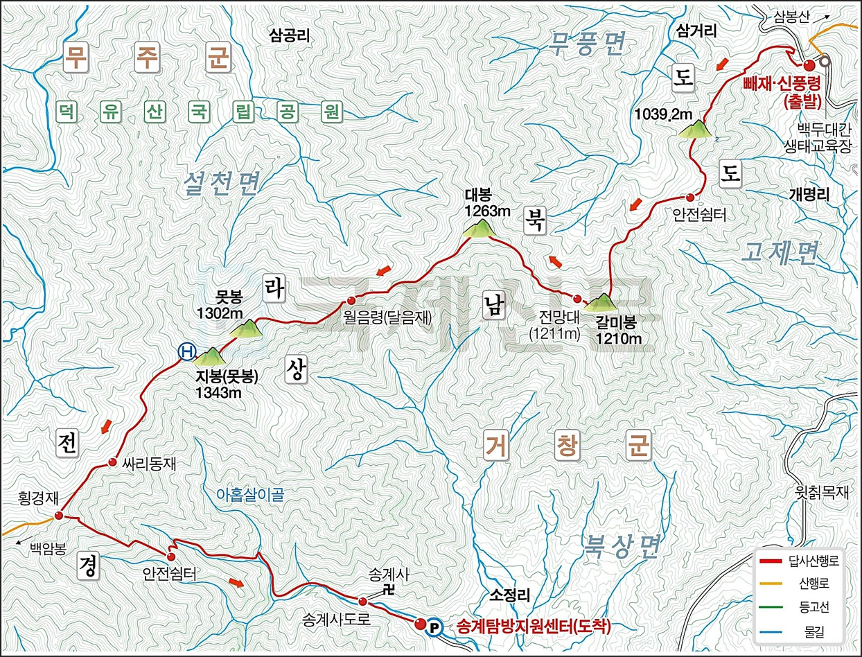 | 산행코스 | 신풍령-빼봉-갈미봉-대봉-월음령(달음재)-지봉(못봉)-싸리동재-횡경재-송계계곡-송계사-송계탐방지원센터 (약 10~11km) |