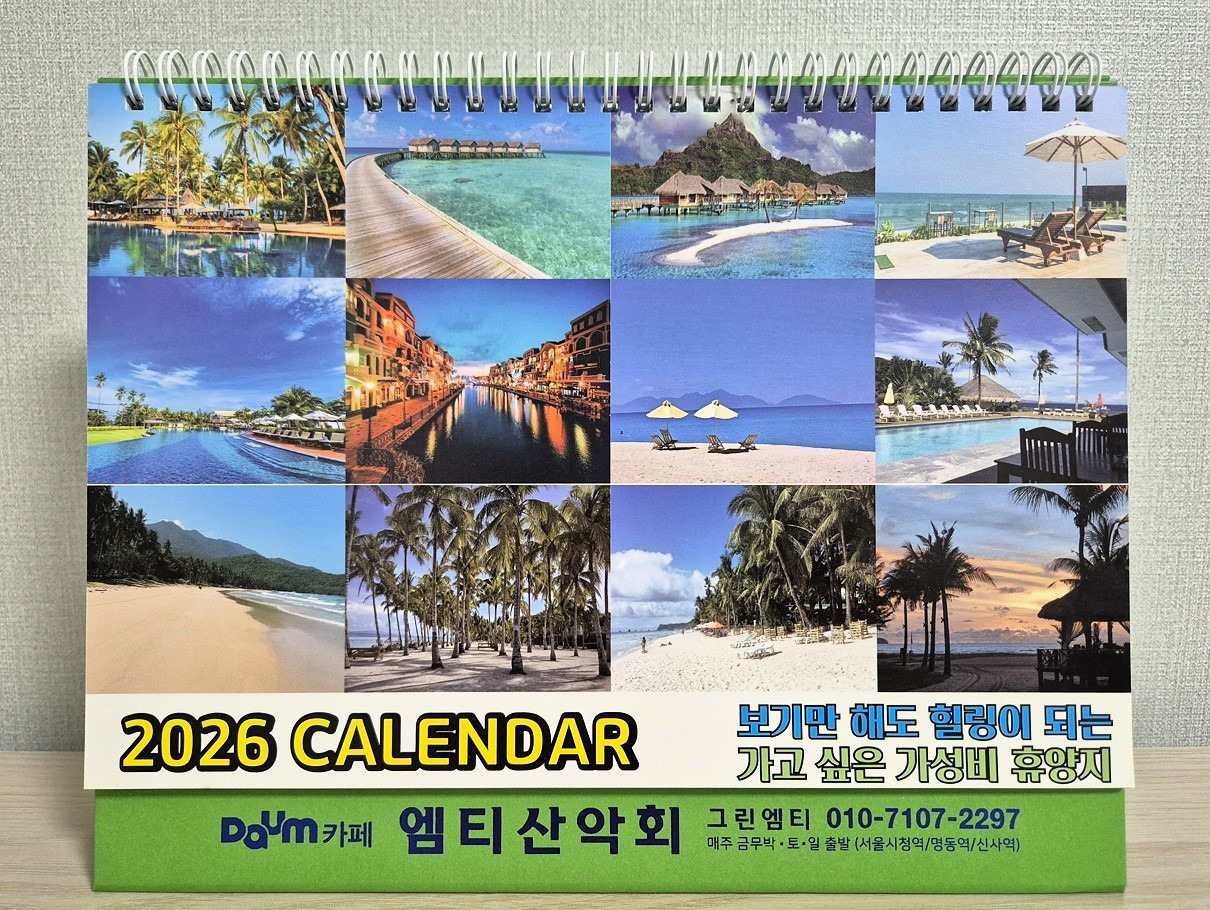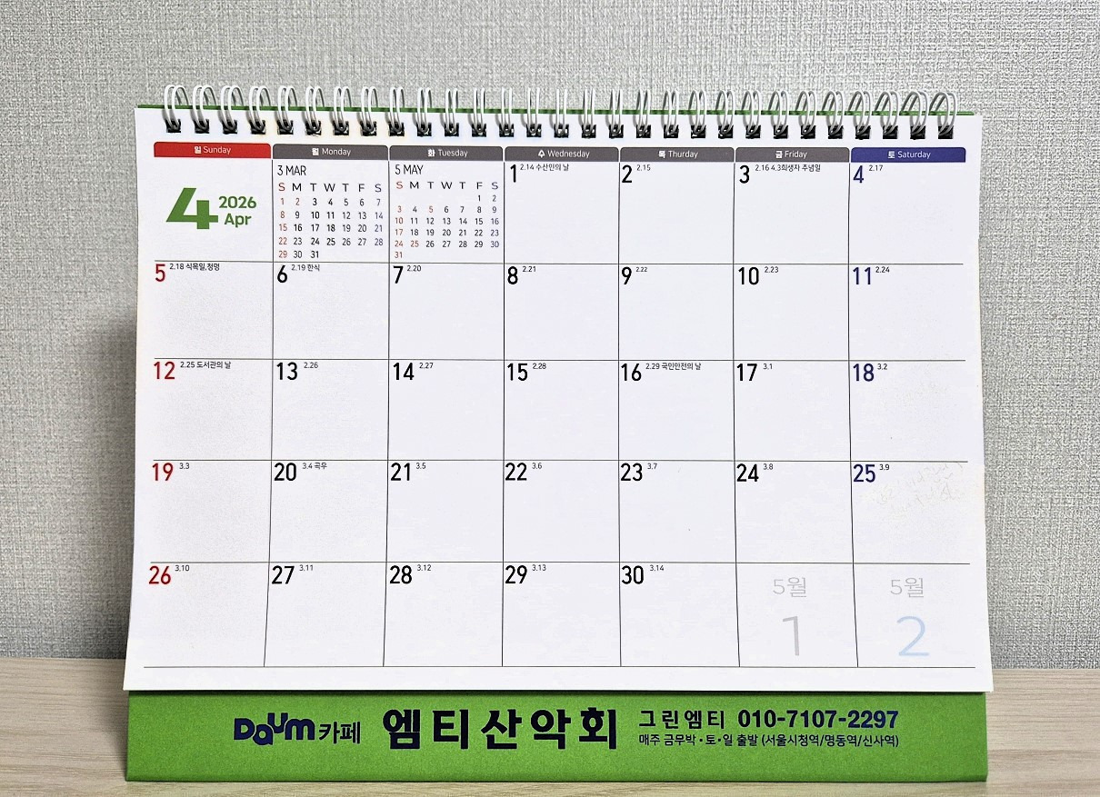 작성자그린엠티(greenmt)작성시간25.12.27조회수67 목록 댓글 0| 회원여러분, 안녕하세요. 1/3(토)태백 금대봉+매봉산(바람의언덕)에 참석하시는 모든 회원님들께는 작지만 정성껏 준비한 "2026년 탁상용 달력"을 드립니다. "붉은 말의 해"인 2026년 '병오년(丙午年)' 새해에도 항상 건강하시고, 안전하고 즐거운 산행+여행이 되시길 기원드립니다. 새해 복(福) 많이 받으십시오. 감사합니다~. |