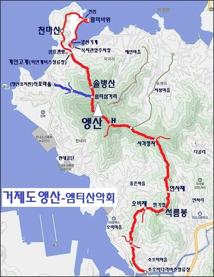 | 산행코스 | A코스(석름봉+앵산+솔병산+천마산): 소오비다리버스정류장-오비재-석름봉-연사재-사각정자-H-앵산 -쉼터삼거리-솔병산-개안고개(외안개버스정류장)-천마산-빈집 -할미바위-광신기계-복지관앞주차장 (약 11~12km) B코스(석름봉+앵산+솔병산): 소오비다리버스정류장-오비재-석름봉-연사재-사각정자-H-앵산-쉼터삼거리 -(솔병산)-석포마을 (약 9km) C코스(솔병산+천마산): 석포마을-쉼터삼거리-솔병산-개안고개(외안개버스정류장)-천마산-빈집-할미바위 -광신기계-복지관앞주차장 (약 6km) |