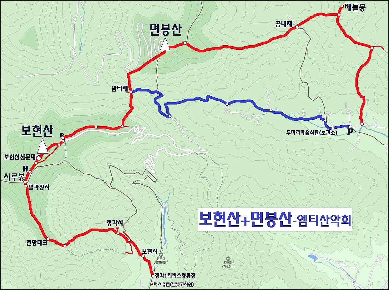| 산행코스 | A코스(보현산+면봉산): 정각1리-정각사-전망데크-팔각정자-시루봉-H-천문대-보현산-천문대주차장 -밤티재-면봉산-곰내재-(베틀봉)-두마리마을회관-주차장 (약 11km) B코스(보현산): 정각1리-정각사-전망데크-팔각정자-시루봉-H-천문대-보현산-천문대주차장-밤티재 -두마리마을회관-주차장 (약8~9km) C코스(면봉산): 주차장-두마리마을회관-(베틀봉)-곰내재-면봉산-밤티재-두마리마을회관-주차장 (원점회귀, 약 9km) |