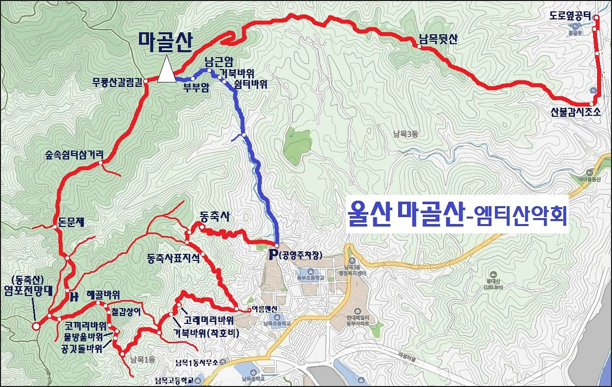 | 산행코스 | A코스: 도로옆공터-산불감시초소-남목뒷산-마골산-무룡산갈림길-돈문재-염포전망대(동축산)-해골바위 -철갑상어바위-코끼리바위-물방울바위-공깃돌바위-거북바위(착호비)-고래머리바위-동축사표지석 -동축사-공영주차장 (약 10km) B코스: 공영주차장-쉼터바위-거북바위-남근암-부부암-마골산-무룡산갈림길-돈문재-염포전망대(동축산) -해골바위-철갑상어바위-코끼리바위-물방울바위-공깃돌바위-거북바위(착호비)-고래머리바위 -동축사표지석-동축사-공영주차장 (원점회귀, 약 8km) |
