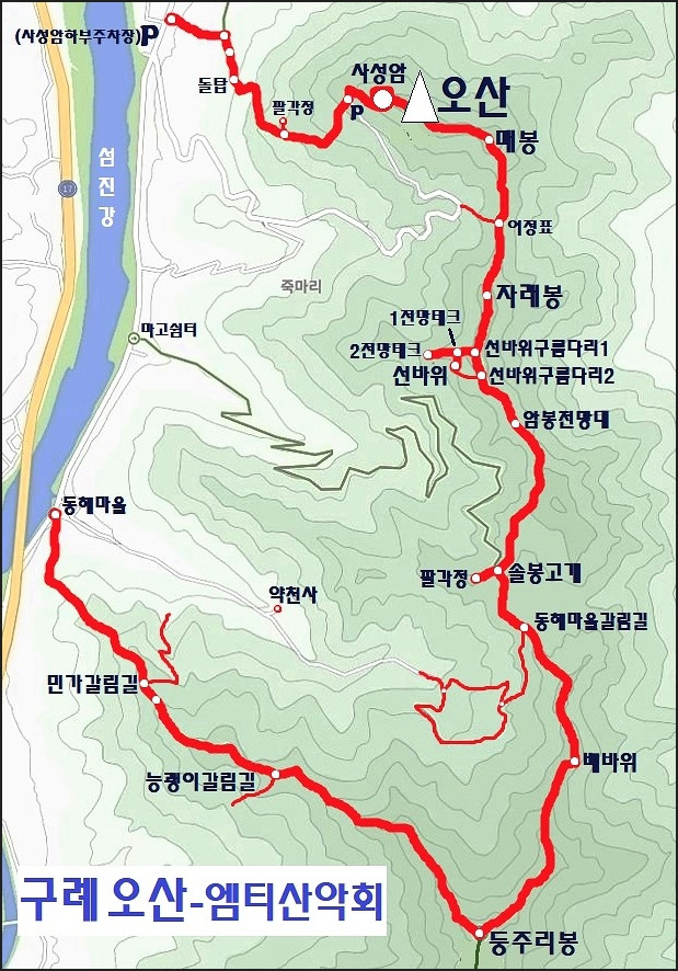 | 산행코스 | A코스: 동해마을-능괭이삼거리-둥주리봉-배바위-동해마을갈림길-솔봉고개-암봉전망대-선바위구름다리1,2 -자래봉-매봉-오산-사성암-(셔틀버스)-사성암하부주차장 (약 8~9km) B코스: 사성암하부주차장-(셔틀버스)-사성암-오산-사성암-(셔틀버스)-사성암하부주차장 (원점회귀, 약 3km) |