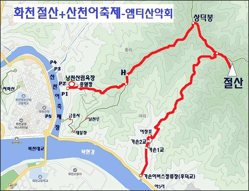 | 산행 / 여행코스 | A코스(절산+산천어축제): 가손이버스정류장(후덕교)-가손1교-가손2교-이정표-절산-상덕봉-H-충열정 -낭천산림욕장-산천어축제장-주차장 (약 7km) B코스(산천어축제): 주차장-산천어축제장-주차장 (원점회귀) |