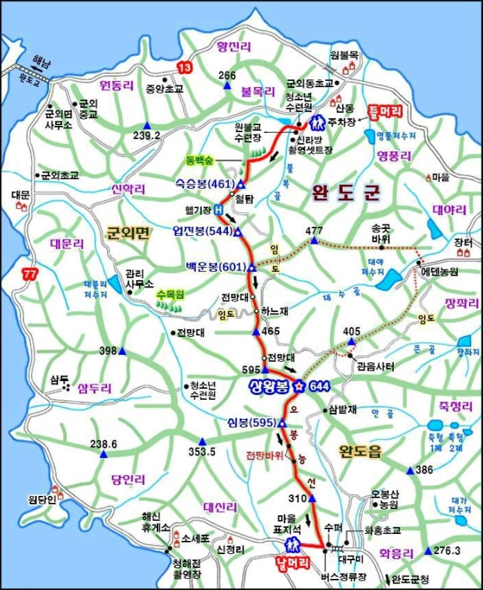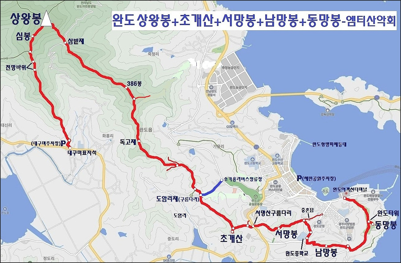 | 산행코스 | A코스(상왕봉): 청소년수련원-숙승봉-업진봉-백운봉-전망데크-하느재-전망대-상왕봉-심봉-오봉능선-대구리 -주차장 (약 10km) B코스(초개산+서망봉+남망봉+동망봉): 소가용리버스정류장-도암리재(구름다리)-초개산-서망산구름다리 -서망봉-남망봉-완도타워-동망봉-완도여객선터미널-주차장 (약 7km) C코스(상왕봉+초개산+서망봉+남망봉+동망봉): 대구미-심봉-상왕봉-삼밭재-386봉-독고재-도암리재(구름다리) -초개산-서망산구름다리-서망봉-남망봉-완도타워-동망봉-완도여객선터미널-주차장 (약 15km) <A코스는 산행후, 전세버스를 이용하여 완도항으로 이동합니다. / B+C코스는 날머리가 완도항입니다.> |