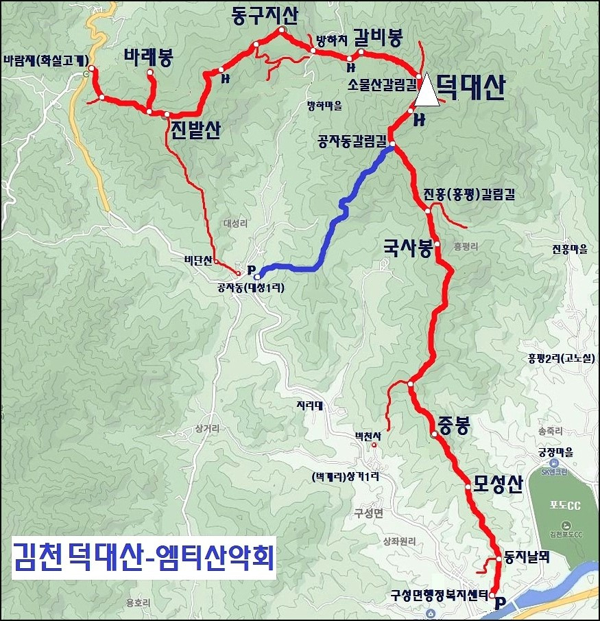 | 산행코스 | A코스(8산): 바람재-(바래봉)-진밭산-H-동구지산-방하치-H-갈비봉-덕대산-H-공자동갈림길-국사봉-중봉 -모성산-동지날뫼-구성면행정복지센터 (약 14km) B코스(5산): 바람재-(바래봉)-진밭산-H-동구지산-방하치-H-갈비봉-덕대산-H-공자동갈림길-공자동(대성1리) -폐교운동장 (약 10km) |