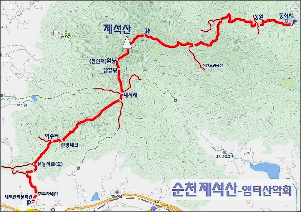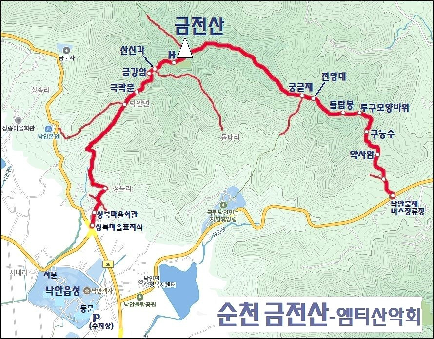 | 산행코스 | A코스(금전산+낙안읍성): 낙안불재버스정류장-약사암-구능수-투구모양바위-돌탑봉-궁글재-금전산-H -산신각-금강암-극락문-성북마을표지석-낙안읍성서문-낙안읍성동문-주차장 (약 7~8km) B코스(제석산): 동화사-농원(버섯체험학습장)-임도-활공장(H)-제석산-신선대(암봉)-남끝봉(암릉)-대치재 -전망데크-약수터-현부자네집-태백산맥문학관-주차장 (약 6~7km) C코스(낙안읍성): 낙안읍성 자유여행 |