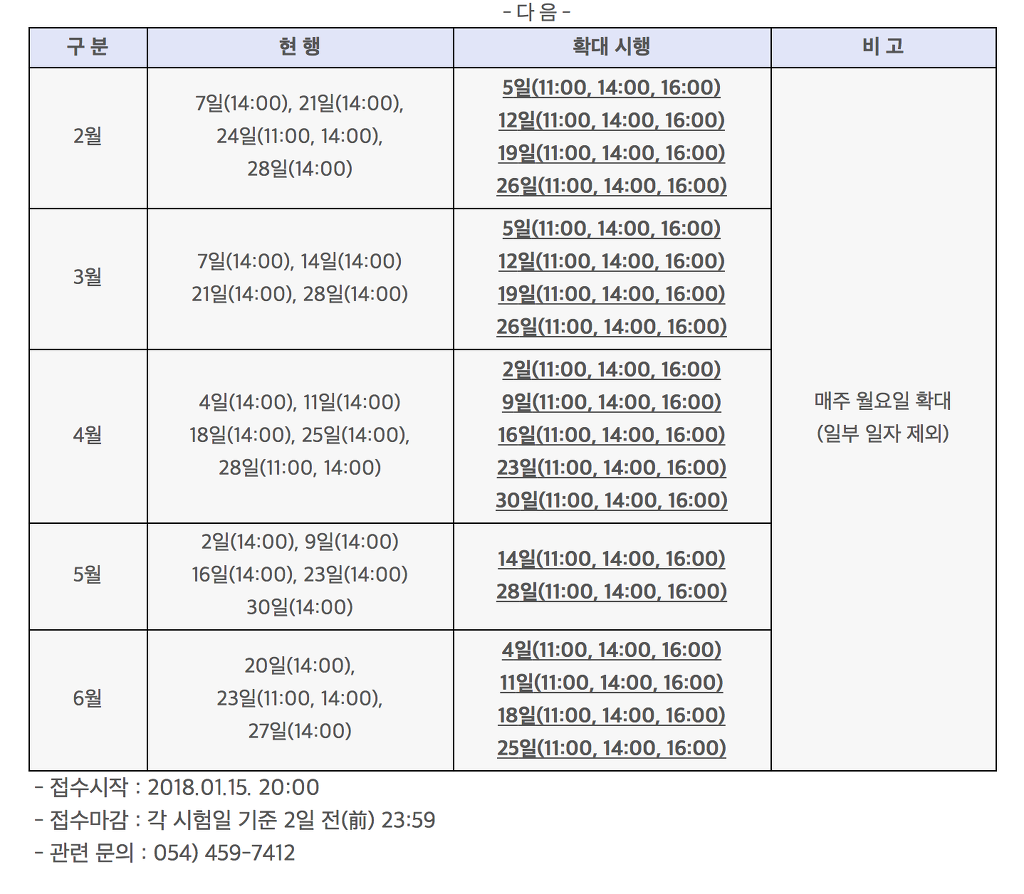 고객 불편 해소를 위하여 다음과 같이 학과시험 시험일(횟수)을 확대하여 시행하고자 합니다.