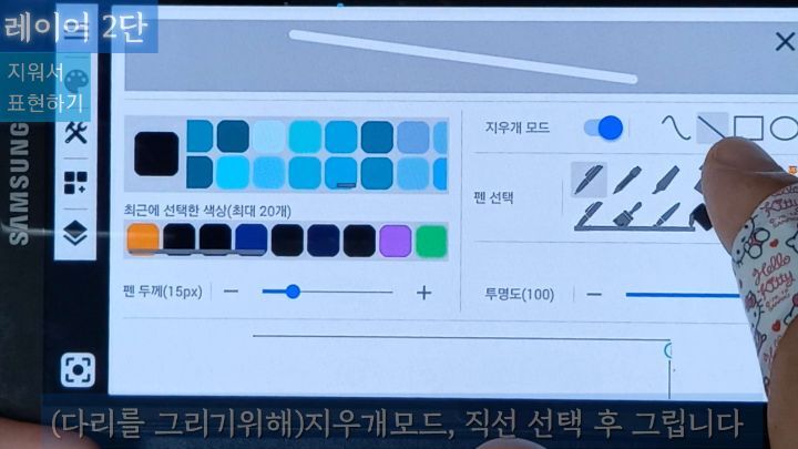 다리의 직선은 윗줄 세번째 도구(마커) 선택해서 지우개모드로 표현합니다