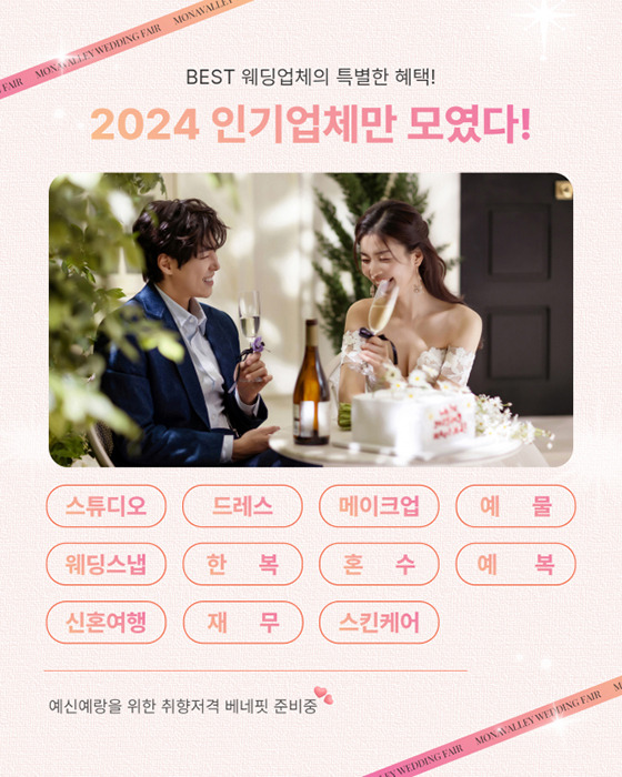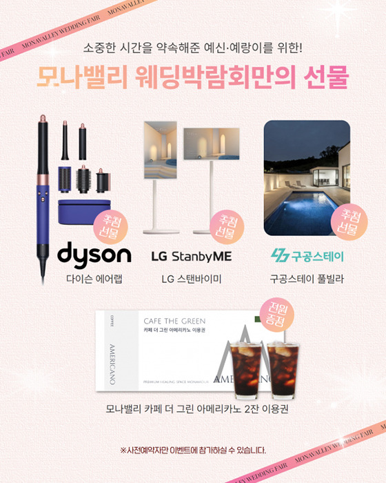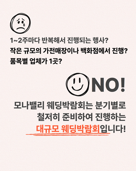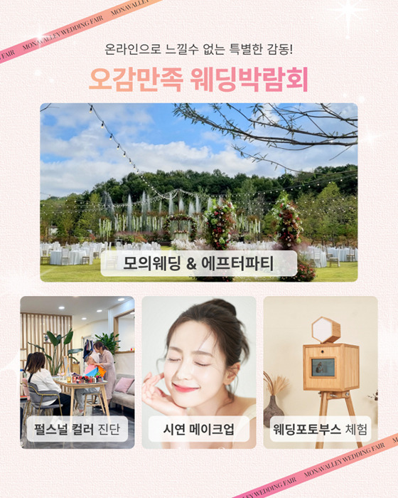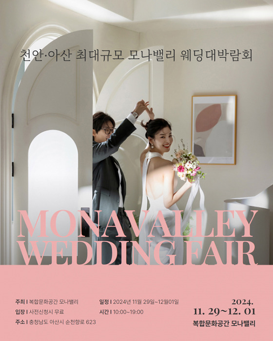 이번 아산 모나밸리 웨딩박람회 행사는 분기별로 진행되는 대규모 웨딩페어로서 모의 웨딩, 에프터 파티, 웨딩 드레스, 메이크업, 포토 부스, 예물, 웨딩 스냅, 한복과 혼수, 예복과 신혼여행 등 다양한 체험과 이벤트가 기다리고 있다고 합니다.