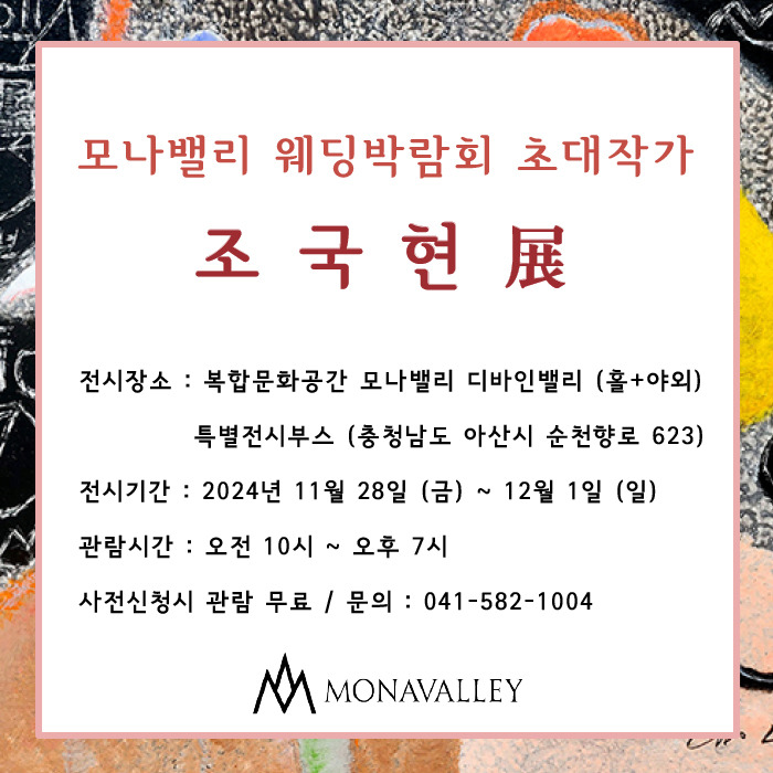 추상화의 대가 조국현 화백이 충청남도 아산시 순천향로 623에 위치한 복합문화공간 모나밸리 웨딩박락회 특별 전시부스 작가로 초대되었습니다.