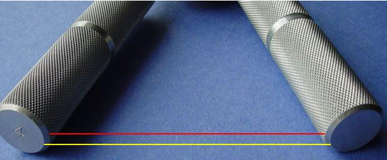 여담으로 핸들너비에 관한 이야기가 나와서 말인데요. 핸들의 너비를 잴 때 악력기가 맞닿는 부분 사이의 거리를 재야 합니다. 아래 사진에 표시해 두었는데요. 노란선이 아니라 빨간선 기준으로 길이를 재야 한다는 것입니다.