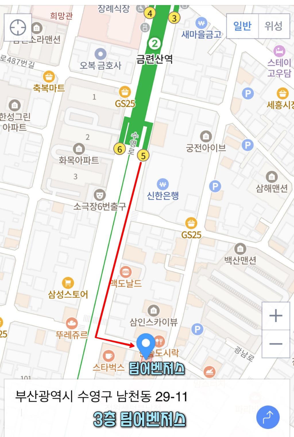 1. 금련산역 5번 출구 에서 직진후 스타벅스 에서 좌회전 해주시면 됩니다.