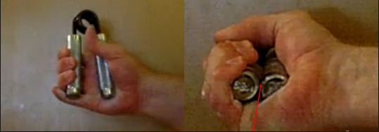 일반적으로 많이 사용되는 악력기인 coc와 bb의 핸들지름은 19mm입니다. 대부분의 사용자들이 너무 별 생각없이 사용해 왔기 때문에 그냥 그런가보다 하고 별다른 자각이 없었는데요. 물론 저도 마찬가지 였습니다.(헌데 이 정도 굵기는 그다지 굵은편이 아닙니다. 한 20mm정도가 적당하다 생각하며 약간 더 커도 무방하다는 생각이 드네요.) 위에서도 언급 했지만, 악력기 닫을 때 가장 중요한 사항 중 하나가 악력기를 압착했을 때 핸들이 감정선 부근에서 맞닿아야 한다는 겁니다. 초보자가 흔히 범하는 실수인 사진2와 같은 위치에 악력기를 놓고 압착을 하게 되면 힘은 충분하지만 손가락의 관절 구조상 손은 안으로 말리려 하고, 악력기는 손목쪽으로 힘이 가해져야 핸들이 닿기 때문에 완전한 압착이 되지 않습니다. 즉 힘주는 방향과 악력기가 닫히는 방향이 엇갈리게 된다는 겁니다.