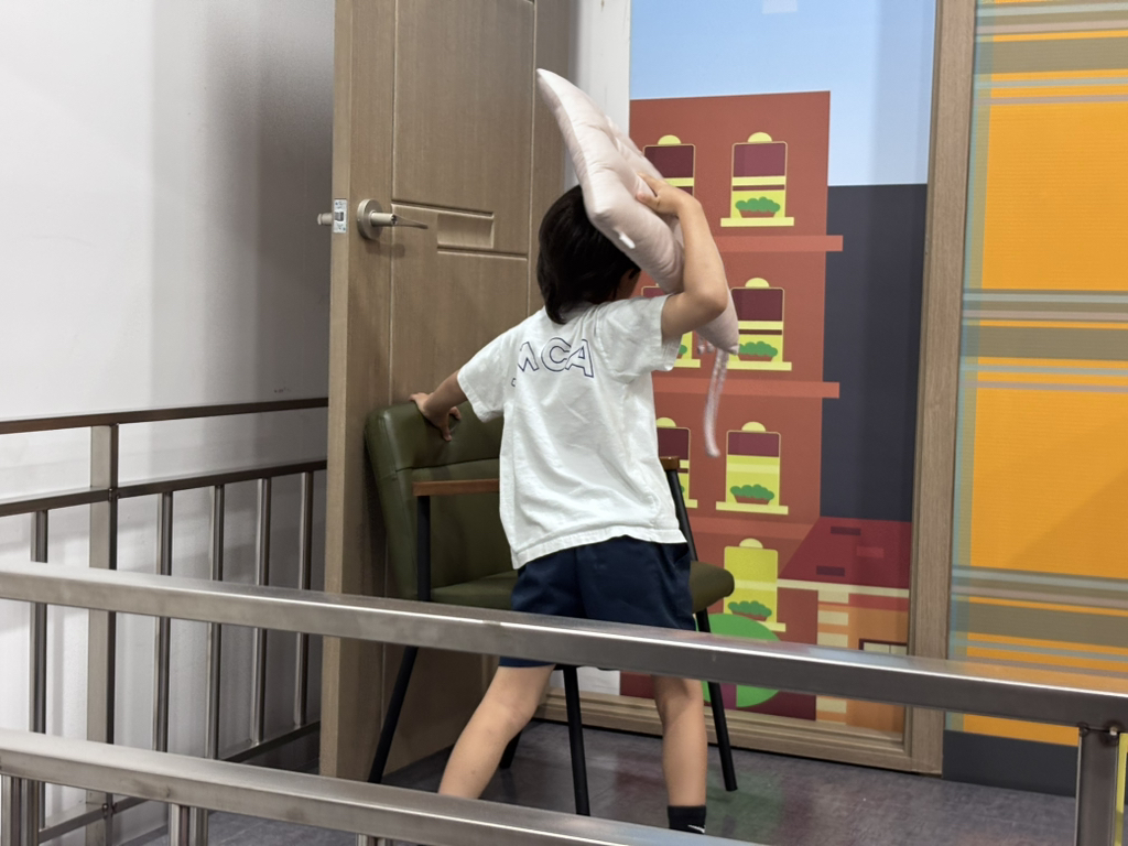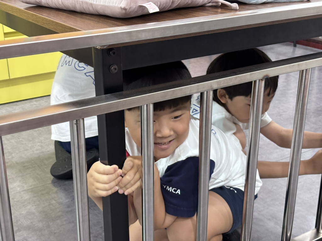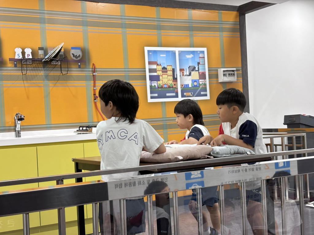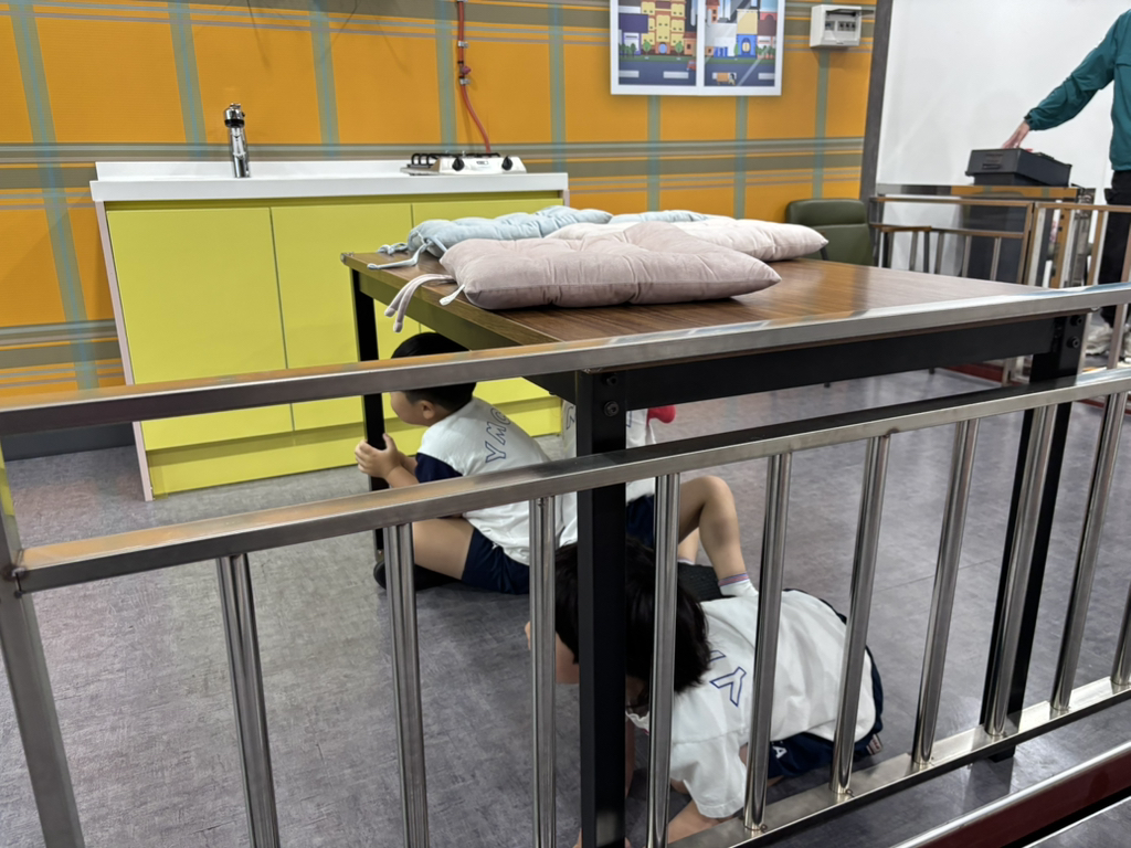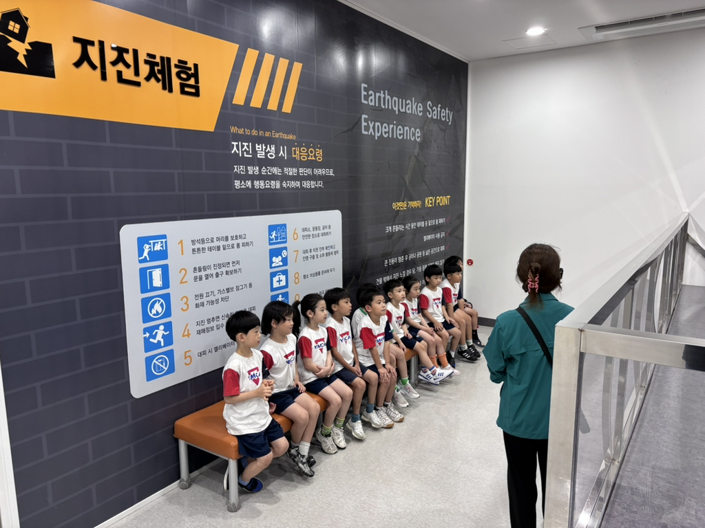 지진 안전 체험관에선 지진 발생시 어떻게 대처해야 하는지 알아 보았어요. 머리를 보호할 수 있는 튼튼한 테이블 밑에 최대한 흔들리지 않도록 다리를 꼭 잡고 기다렸다가 지진이 멈췄을 땐 문을 열고 닫히지 않게 고정해 나갈 통로 확보, 가스 잠그기, 전기 차단기 내리기 등을 배웠습니다.