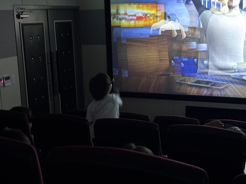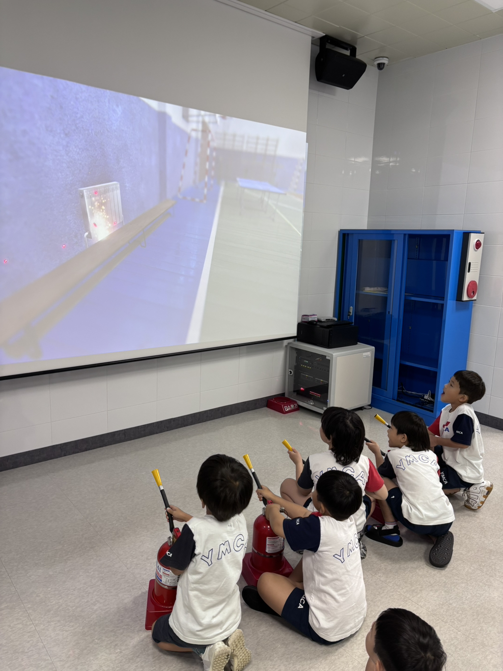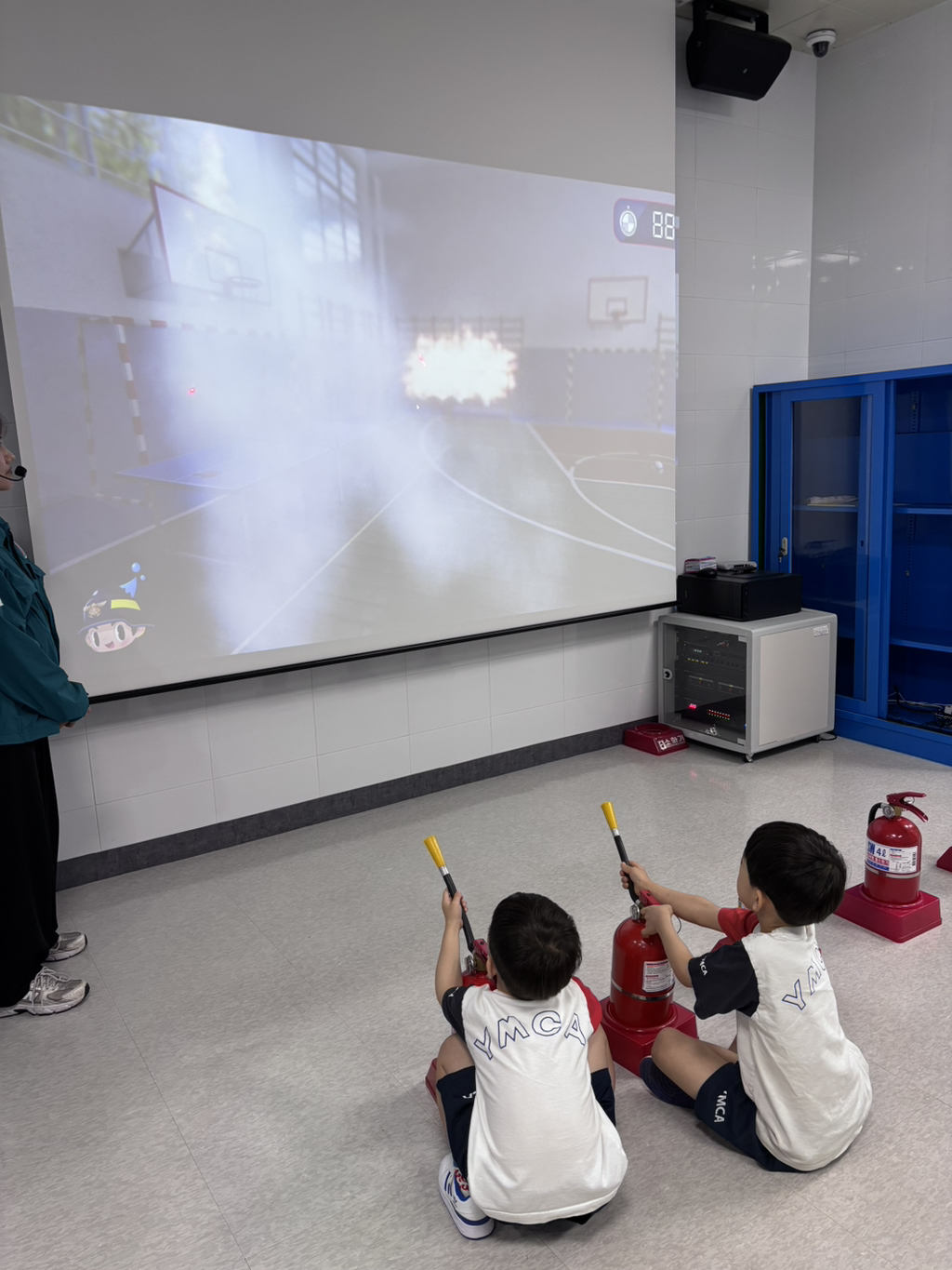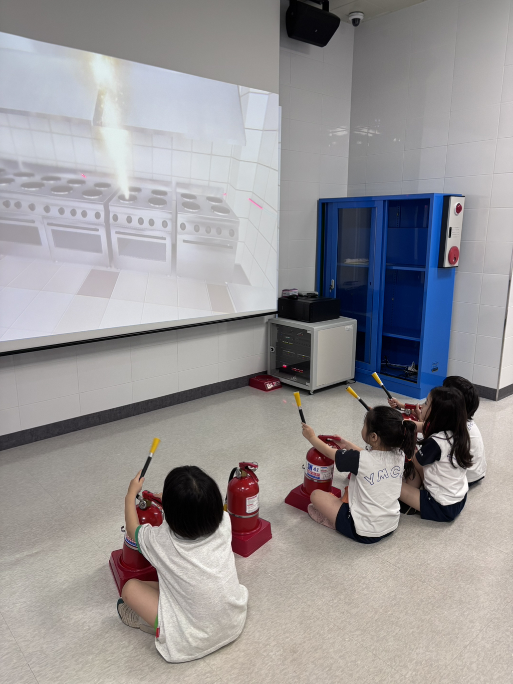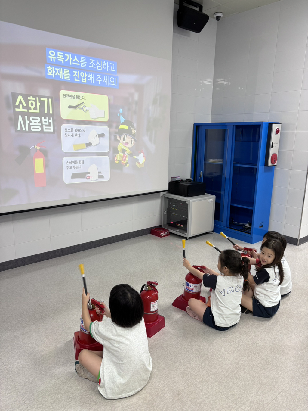 거기 가면 소화기 모양으로 생긴 뭘 주던데~ 기대하며 출발! 가장 먼저 3D 영상 체험실에서 지진 발생시 대피 요령을 영상으로 보았어요. 3D라고 안경쓰고 손을 뻗어 허공을 휘저으며 보던 행복이들..^^