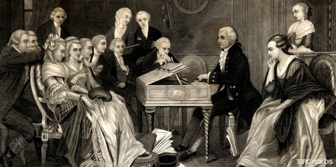귀족과 예술가들 앞에서 자신의 곡을 연주하고 있는 모차르트. 피아노 협주곡 20번은 모차르트의 생활이 궁핍하던 시절 예약연주회를 위해 작곡된 곡이다.