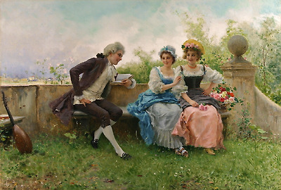 정원 의자에 앉아 책을 읽고 있는 여인 옆에 사랑하는 남자가