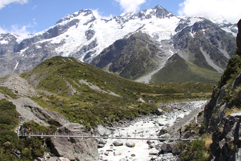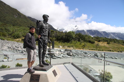 차를 ⓘ건물 뒤편에 주차하고 ⓘ안으로 들어갔다. 에드먼드 힐러리 경의 동상이 마운트 쿡 산을 바라보고 있다. 함께 사진을 찍었다. ⓘ에는 눈 위를 다니는 차도 전시되어있고 등산장비들도 있다. 흑백 사진과 칼라 사진이 등산의 역사를 보여주고 있다. 식당도 있고 기념품 가게도 있어 제법 넓다. 지도 한 장을 받아들었다. 후크벨리 트레킹과 타즈만 빙하를 둘러보는 주차장을 안내받고 나왔다. 날씨가 맑아 올려다보는 하얗게 솟아있는 봉우리는 감동적이고 우리를 오라고 초대한다. 불행히도 마운트 쿡의 정상 부근에서는 1991년 12월에 대규모 눈사태가 발행했다. 그 결과 산봉우리의 고도가 11m나 낮아져 버렸다. 지금도 일부 지도 등에 해발 3764m 라고 표기가 남아있는 것은 그 때문이란다. 영화 파라마운트사가 제작한 영화 시작 장면에 나오는 하얀 설산에 별들이 빙글 돌아가는 멋진 장면의 산이 바로 쿡 산이다. 우리는 후커 벨리 트랙을 걷기로 했다. 차를 타고 출발점 주차장에 차를 세웠다. 일단 차 안에서 점심을 먹었다. 아침식사와 같이 소세지, 짠지로 잔뜩 식사를 했다. 목적지는 Hooker Glacier Lake 까지 갔다 오는 것이다. 길은 잘 만들어져 있어 걷는데 아무 지장이 없다. 뜨거운 태양이 좀 부담스럽지만 이렇게 맑은 날, 걸을 수 있다는 것이 우리에게 주어진 복이었다. 감사하는 마음으로 가볍게 걷기 시작했다. 사람들이 많다. 출발하니 오른쪽에 버티고 있는 Mt. Wakefield 에 의해 쿡 산의 모습이 가려져있고, 왼편에 하얗게 만년설을 이고 있는 Mt Sefton이 우리를 반겨 준다. 이 산에서 흘러내리는 빙하에 의해 만들어진 호수가 Mueller Glacier 호수다. 회색빛 호수가 외계에 온 기분이다. 전망대에 올라보니 우리가 건너야 할 첫 번째 다리가 눈 아래 보인다. 뒤를 돌아보면 U자형 평원이 시원하게 펼쳐져 있다. 다리를 향해서 걸어간다. 지리산 계곡 물 같이 격류가 흐르는 냇가 위에 설치되어 있는 쇠줄 다리다. 별로 흔들림이 없이 건너간다. 산기슭을 걷다가 보니 또 다리가 보인다. 계곡을 이어서 2번째 다리는 더욱 스릴이 있게 암벽에 붙여 만들어져 제법 흔들린다. 물이 거칠게 흘러 두려움이 생긴다. 두 번째 다리를 건너니 드디어 쿡 산의 정상이 보인다. 정말 멋지다. 산 정상부근에 쌓여 있는 눈의 모습이 사람의 얼굴같다. “산 할아버지 구름모자 썼네” 라는 노래가 생각난다.