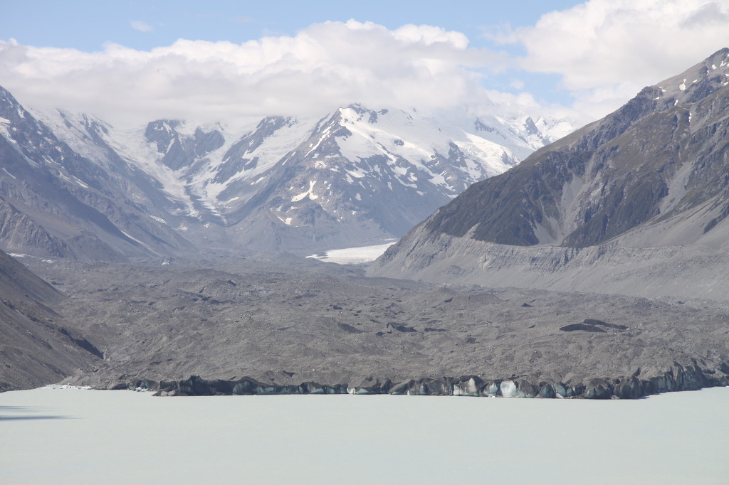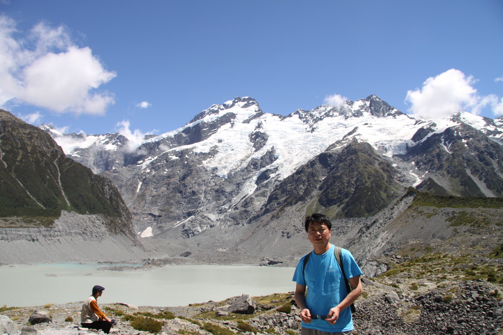 먼저 블루 호수로 방향을 잡았다. 왼편에 호수가 초록색으로 3개 이어져 있다. 작지만 보석처럼 빛이 난다. 처음에는 하나만 보이지만 돌산을 오르면 3개가 보인다. 계속 오르니 눈앞에 예상치 못한 낯선 세계가 펼쳐진다. 회색빛 호수에 빙하 덩어리가 몇 개 더 있다. 호수 끝에는 설산에 검은 흙들이 잔뜩 쌓여있다. 생명체라고는 보이지 않는, 살 것 같지도 않는 좀 두려운 모습이다. 마운트 쿡 주변에 몇 개의 빙하가 있지만 대표적인 것은 이곳 테즈만 빙하란다. 이 빙하를 무대로 행해지는 빙하스키 타기는 뉴질랜드에서 가장 유명하다. 해발 2400m의 테즈먼 산을 출발하여 도중에 풍경을 즐기며 10km, rm 이상을 내려가는 ‘스키소풍’이라는 멋진 스키 할강은 각 나라 스키어들의 꿈이란다.