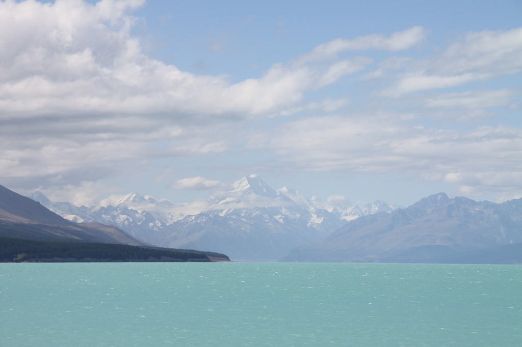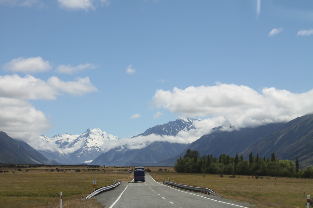 12시가 좀 넘었다. 마운트 쿡을 향해 달려간다. 여기서부터 56km라고 이정표가 보인다. 호수를 오른쪽으로 끼고 하얀 설산을 향해 달려간다. 가는 길이 시원하게 잘 뚫려있다. 멋진 경치가 정면과 좌우에 펼쳐진다. 특히 정면에 영화처럼 이어지는 설산의 산맥들이 감동적이다. 초원을 달리는 앞 차도 멋지다. 해발 3755m 라는 최고의 높이로 뉴질랜드를 대표하는 봉우리가 마운트 쿡이다. 이 산을 중심으로 하여3000m 가 넘는 18개의 봉우리와 골짜기를 메우는 수많은 빙하에 의해서 형성되는 서던 알프스 산맥은 실제로 남반구의 알프스라는 별명이 무척 어울린다. 그러나 산악지대 특유의 불안정한 기상 때문에 그 웅대한 모습을 확실하게 보려면 이에 따른 행운이 필요하다는데, 맑은 날로 인해 우리는 행운아가 되었다.