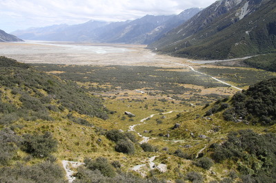 커다란 바위 위에 앉아서 회색빛 호수를 내려다보고 있으니 묘한 감정이 생긴다. 참 특이한 장면이다. 뭔가 설명할 수 없는 처음 보는 자연 환경이다. 잠시 후에 아쉽지만 바위산을 내려온다. 조심스럽게 내려오며 고개를 들고 쳐다보는 경치도 멋지다. 펼쳐진 벌판 끝에는 푸카키 호수가 보이고 양 옆에는 높고 험한 산들이 U자를 만들고 이어진다. 참 시원한 풍경이다. 주차장에 금방 도착했다.