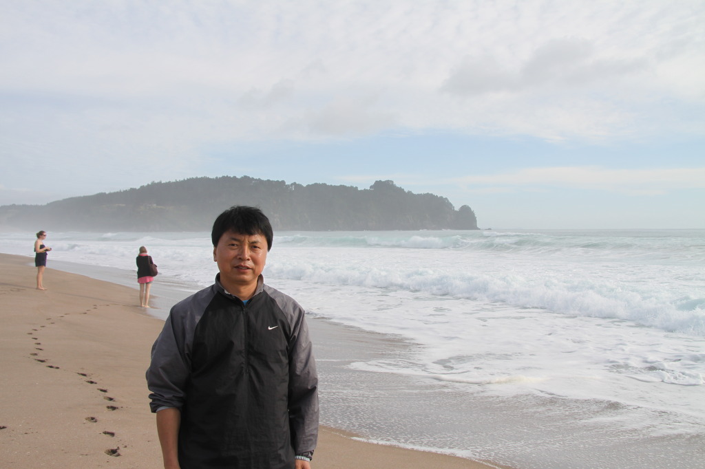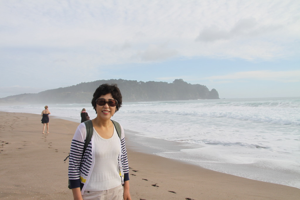 Whenuakite라는 마을에 오니 Hot water beach 간판이 보인다. 바다를 향해 우회전하여 들어간다. 유명세를 갖고 있는 비치에 도착하니 왠지 썰렁하다. 해변에는 약간 거친 파도만 철렁이고 사람이라고는 아가씨 둘 뿐이다. 안내표지판을 보니 물이 너무 많이 들어와 있어 뜨거운 온천수가 나오는 곳에 접근할 수가 없었다. 정보 부족이다. 온천수가 나오는 해변을 만나려면 시간을 알아야한다. 바닷물이 빠져나가는 오후가 되어야 모습을 드러낸다. 그래도 좋다고 아내와 사진을 찍으며 백사장에서 시간을 보냈다.