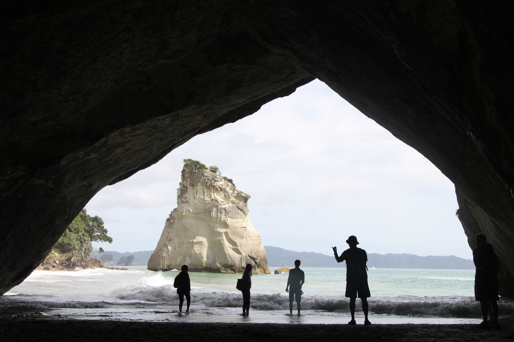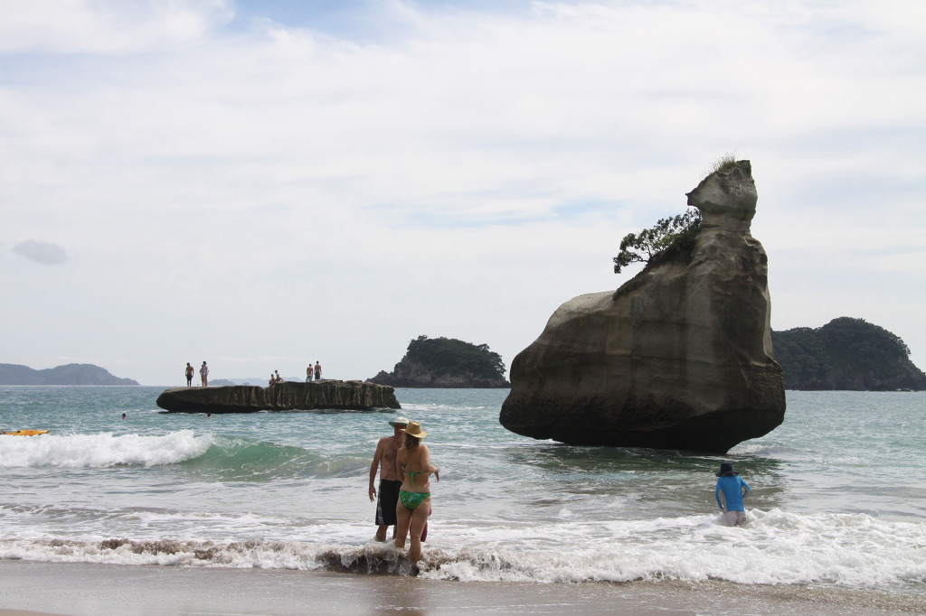 작은 해변 3개를 지나니 드디어 Cathedral Cove가 나타난다. 숲과 절벽으로 가려진 보석 같은 해변이다. 하얀 바위들이 파도에 의해 멋지게 조각되어 아름다운 경치를 제공해 준다. 무엇보다도 시원하게 뻥 뚫린 터널 바위가 가관이다. 찾아온 보람이 있다. 백사장의 모래도 곱고 숲이 백사장과 이어져 그늘이 있어 좋다. 남쪽 해변 끝에는 절벽이 있고 그 위에서 떨어지는 물이 폭로를 이뤄 천연 샤워장을 연출하고 있다.