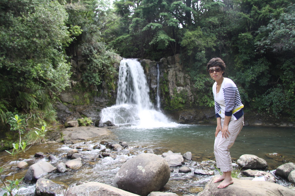 다음 방문한 곳이 Waiau Falls다. 5번 도로나, 25번 도로에서 비포장으로 약 7km를 들어간 곳에 있는 폭포다. 계단 모양의 이 폭포는 높이가 약 8m이며 천연 풀로 되어 있어서 수영도 할 수 있다. 도로에서 표지판을 따라 숲 속 길을 내려가면 만날 수 있다. 작은 다리 아랫니다. 폭포를 배경으로 사진을 찍고 물장난을 하다가 올라왔다. 큰 감흥은 없지만 하나씩 찾아보는 재미가 있다.