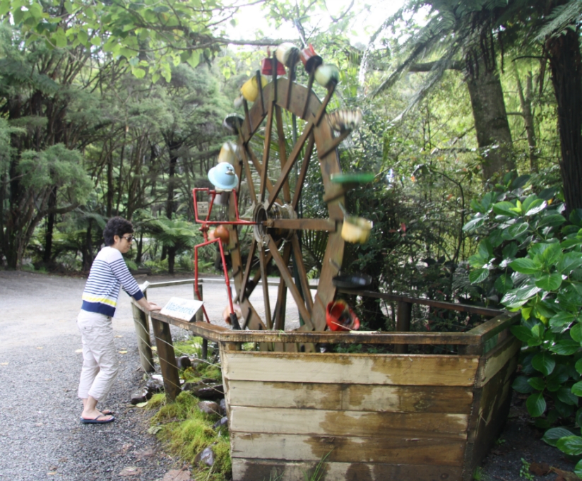 Water works는 2010년에 뉴질랜드 최고의 테마파크로 선정된 곳이다. 숲속에 70여개의 테마로 물과 연관된 놀이나 작품, 특히 폐품을 이용한 것으로 유명하다. 흐르는 시냇물과 연못, 분수 등이 기발한 아이디어 작품으로 연결되어 있는 곳이다. 시간이 너무 늦어서인지 사람들이 거의 없다. 주방용품으로 만들어진 작품과 재활용품으로 만들어진 물레방아도 보인다. 시간이 없어 그냥 돌아섰다. 입장료도 생각보다 비싸다.
