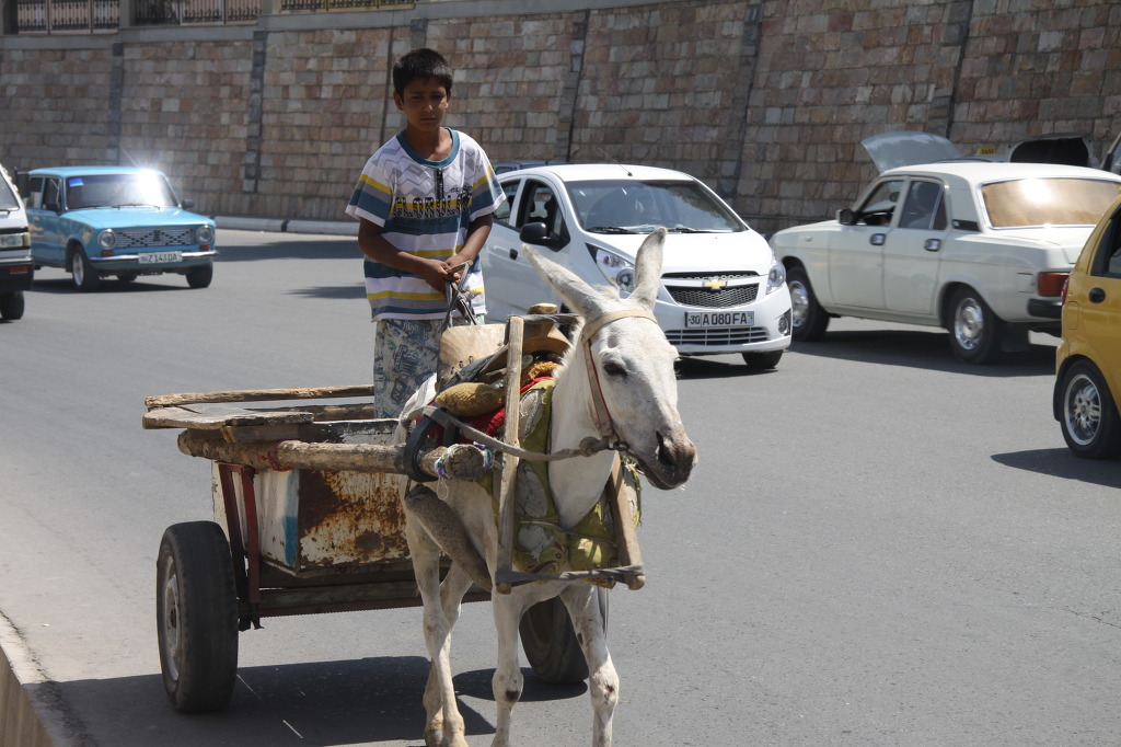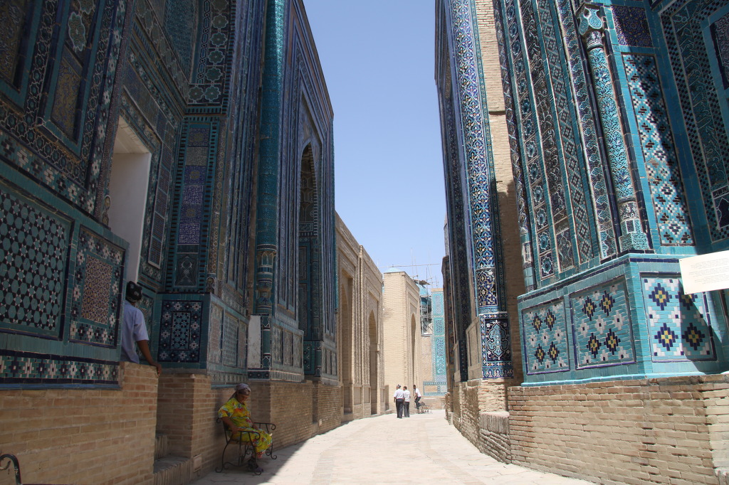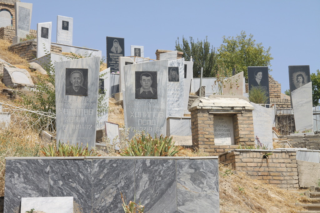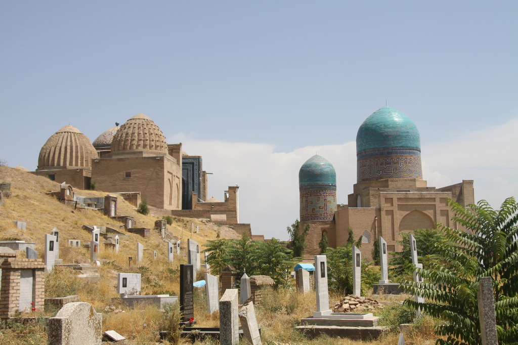 샤흐진다 방향으로 걸어가는데 공동묘지가 길게 이어진다. 비석에는 흑백사진이 크게 있다. 주로 1930년대 태어나 1970년대부터 2000년 사이에 죽은 이들의 무덤이다. 비스듬한 언덕에 가득 차 있다. 이 공동묘지 한 복판에서 푸른 돔들의 아름다움을 자랑하는 샤흐진다 영묘가 있다. 날씨가 무척 뜨겁다. 거리에는 그늘이 없어 공동묘지로 걸어간다. 그늘이 있어 시원하고 묘지라 오싹해서 육체와 정신이 모두 시원한 것 같다. 거리에는 차들이 제법 달린다. 주로 대우차가 많다. 차들 속에서 함께 달리는 노새 달구지도 보인다.
